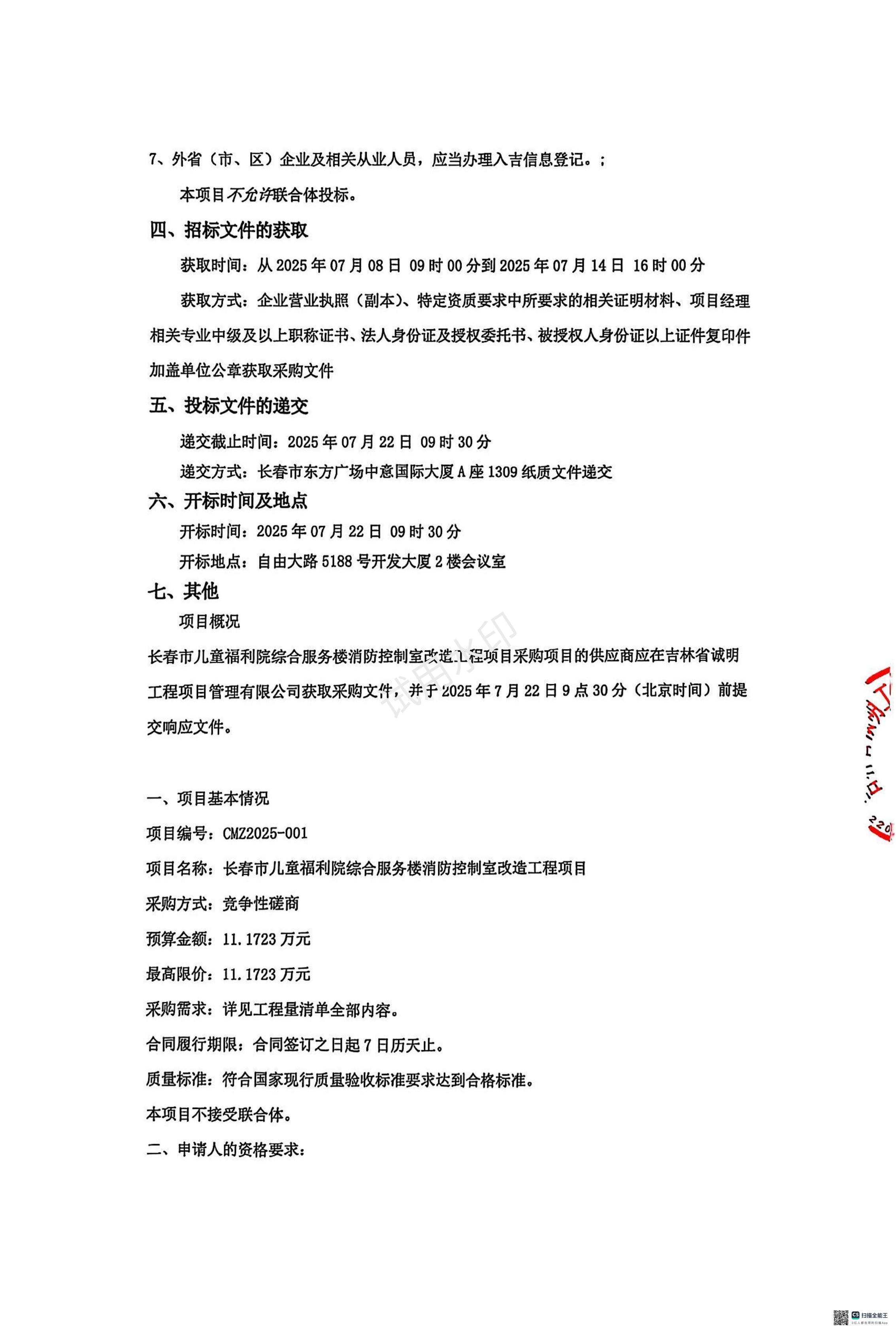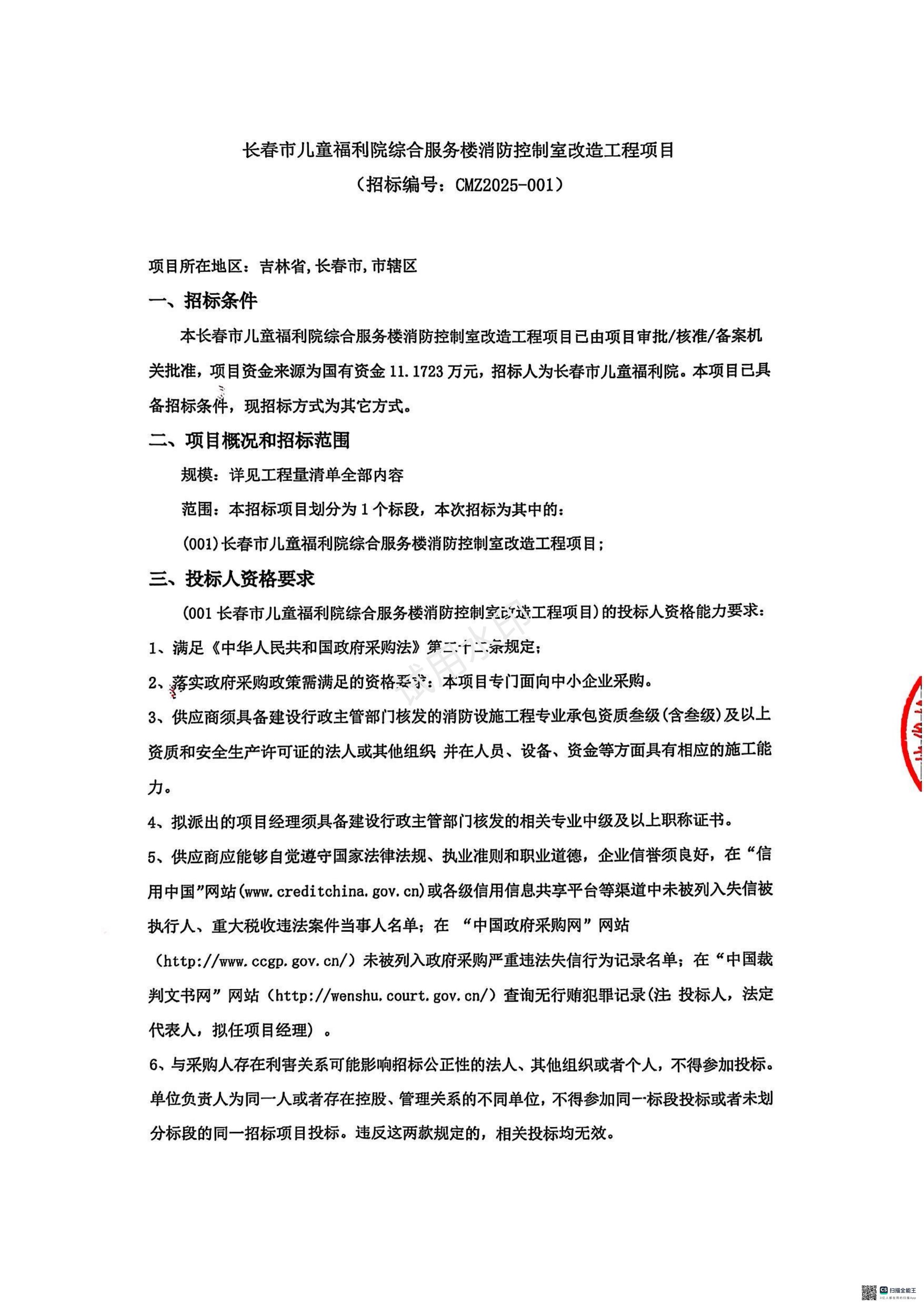 关于长春市儿童福利院综合服务楼消防控制室改造工程项目(招标编号:MZ2025-001)项目的公示